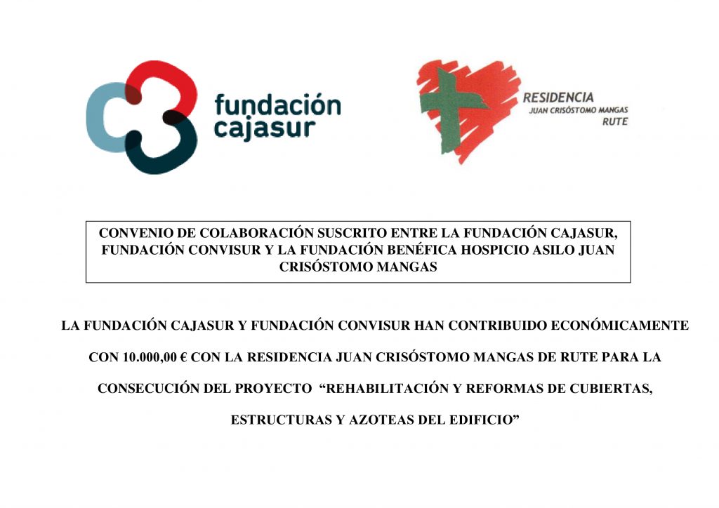 Proyecto: Rehabilitación y Reformas de Cubiertas, Estructruas y Azoteas del Edificio Residencia Juan Crisóstomo Mangas. Gracias al Convenio de Colaboración suscrito entre la Fundación Cajasur, Fundación Convisur y la Fundación Benéfica Hospicio Asilo Juan Crisóstomo Mangas por hacer posible la continuidad de la rehabilitación del edificio antiguo de la Residencia Juan Crisóstomo Mangas.