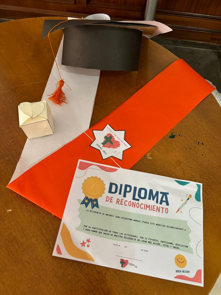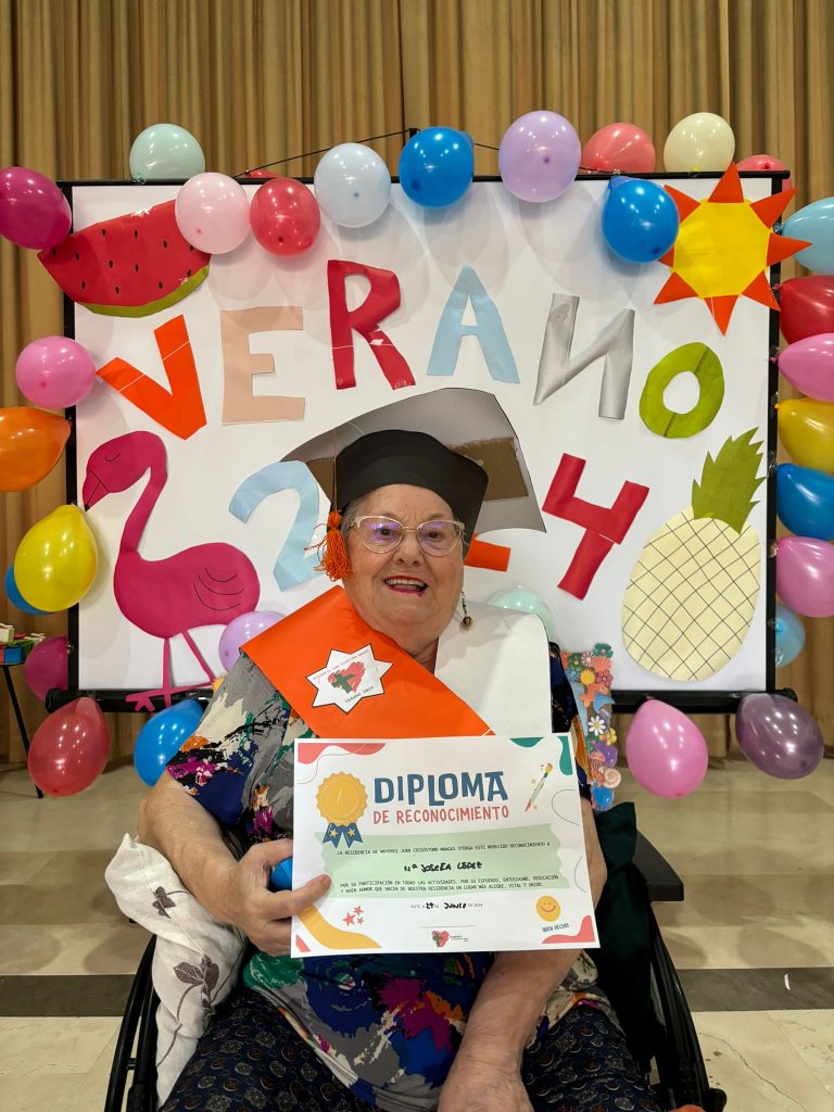 Hoy hemos estado de celebración homenajeando a nuestros mayores por su participación en todos los talleres, su esfuerzo, su dedicación, entusiasmo y buen humor que hacen de nuestra residencia un lugar más alegre, vital y unido. Nuestra particular “graduación” ha hecho sonreír mucho a nuestros residentes, a los que se les ha entregado sus gorritos, bandas, diplomas, además de un regalito. Y para finalizar, nos hemos comido un fresquito helado.