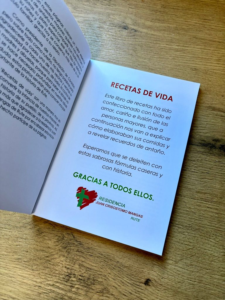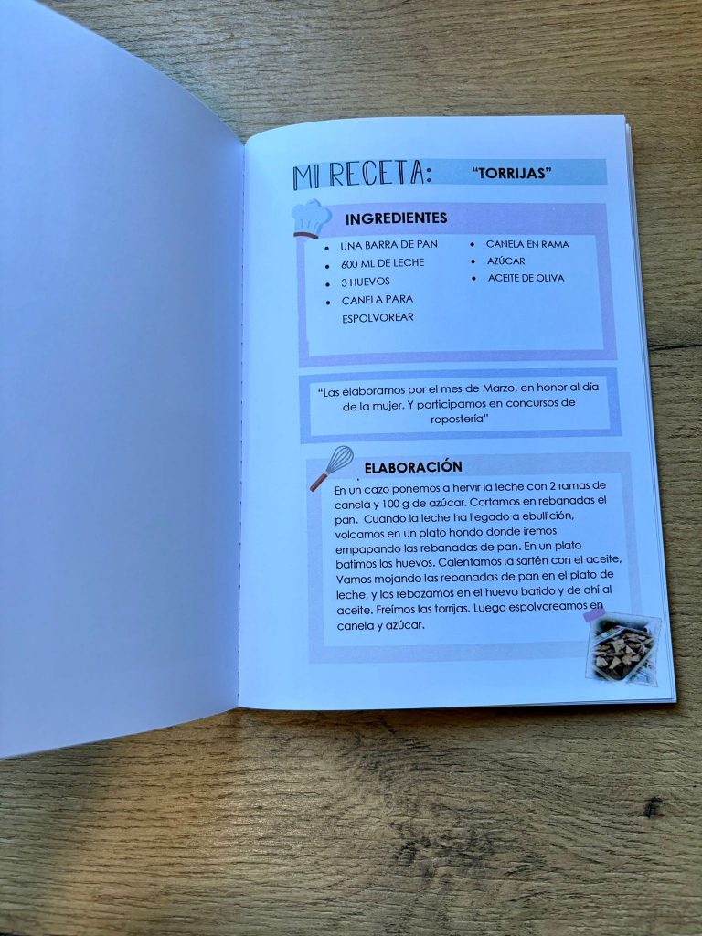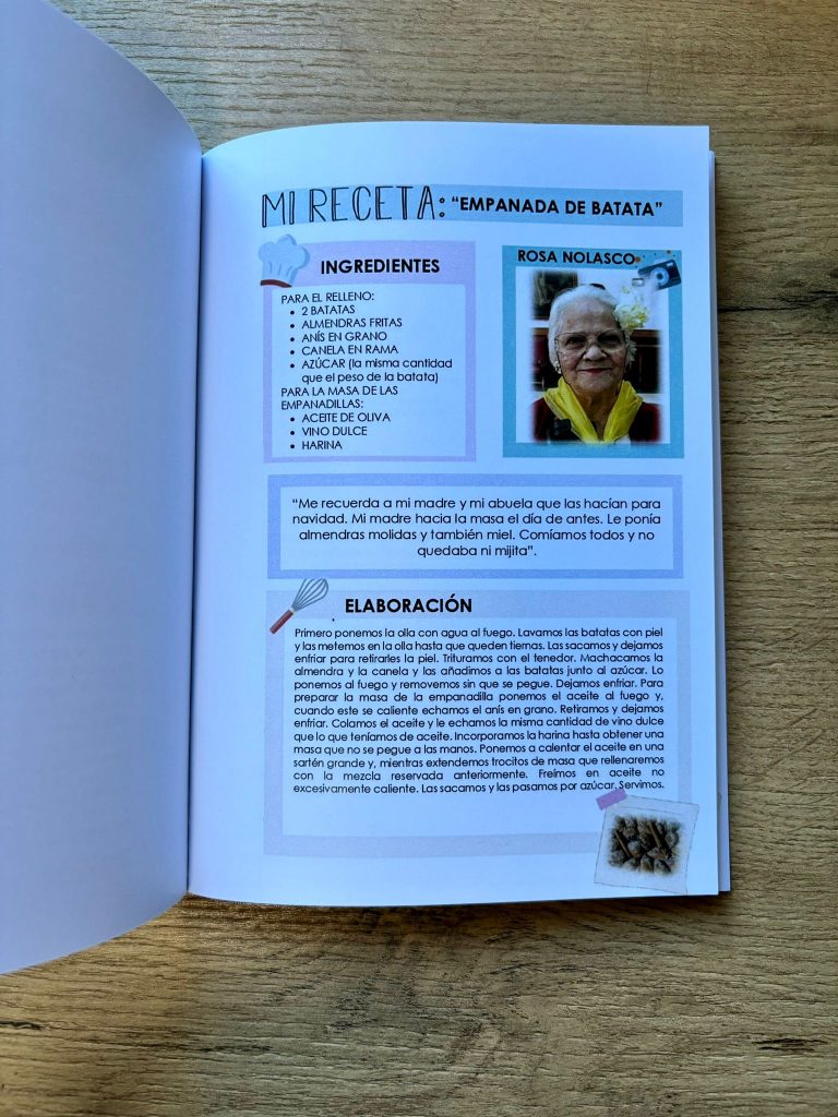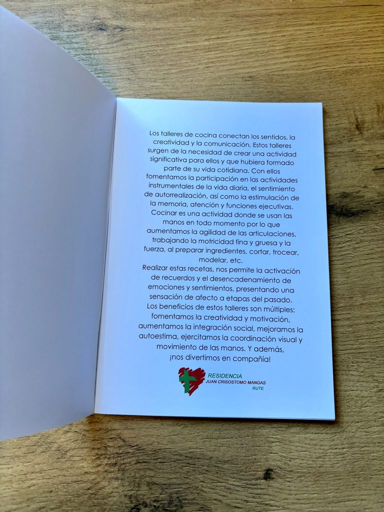 Os presentamos nuestro primer libro de recetas, confeccionado con todo el amor, cariño e ilusión por las personas mayores residentes en nuestro centro. En este libro nos van a explicar cómo elaboraban sus comidas y a revelar recuerdos de antaño. Contiene una colección de recetas que han pasado de generación en generación, preservando métodos de cocina tradicionales y sabores auténticos que a menudo se pierden en la cocina moderna. Las personas mayores aportan sabiduría y trucos culinarios que han aprendido a lo largo de su vida. Cada receta suele ir acompañada de historias personales, recuerdos familiares y anécdotas que hacen que el libro sea más que un simple recetario, convirtiéndolo en una crónica de vidas y tradiciones. Las recetas están escritas de manera sencilla y detallada, lo que facilita su seguimiento incluso para los cocineros novatos. Este libro nos ayuda a preservar y difundir el patrimonio culinario de diferentes familias y fomenta la conexión entre generaciones al compartir conocimientos y experiencias culinarias.